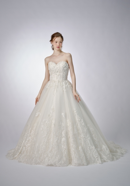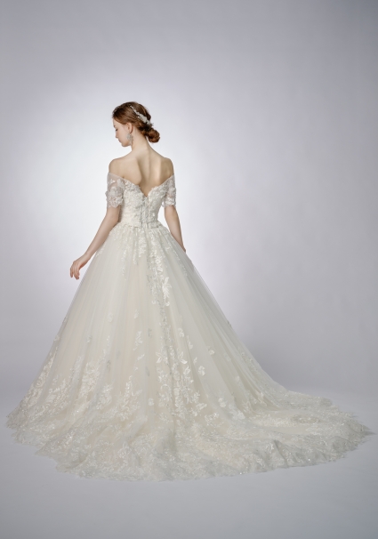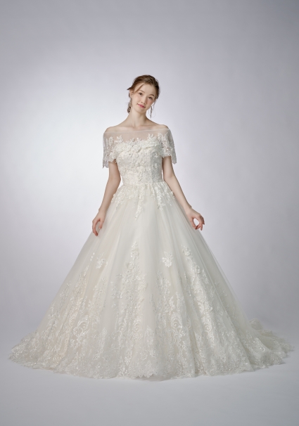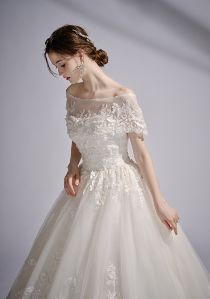 | 静かに揺れる、繊細なチュール。 光をまとい、空気を含んだような軽やかさが、花嫁の存在を際立たせます。 レースのロールカラーを纏えば、優雅でクラシカルな佇まいに。 外せば、洗練されたビスチェスタイルへ。 2WAYという選択が、花嫁の美しさに奥行きを与えます。 デコルテを美しく描くハートカット。 そして振り返った瞬間に息をのむ、大胆で計算されたバックカット。 前からも、後ろからも、視線を惹きつける一着。 甘さだけでは終わらない。 可憐さと凛とした強さを併せ持つ、鈴乃屋一押しのウェディングドレス。 |