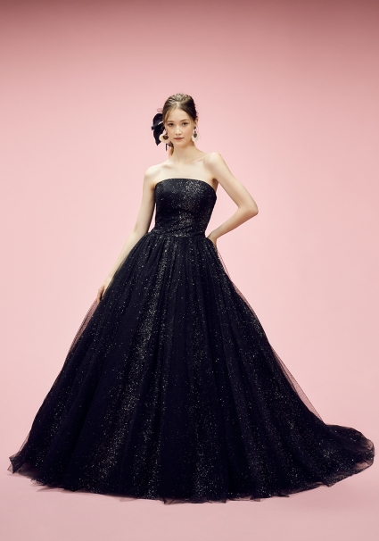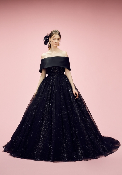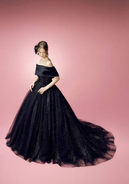 | 深く、凛としたブラック。 その存在感は、静けさの中でこそ際立つ。 チュールに織り込まれた無数のグリッターが、 動きに呼応し、無数のグリッターが圧倒的な光を放つ。 一歩踏み出すたび、光は連なり、空間そのもの全てを魅了という言葉で支配していく。 ロールカラーを纏えば、構築的でエレガントな佇まい。 外せば、洗練を極めたビスチェが現れ、 より研ぎ澄まされた美しさを描き出す。 2WAYという選択が、花嫁の表情に確かな奥行きを与える。 甘さに寄らず、可憐さにも逃げない。 強さ、品格、そして主役としての覚悟。 すべてを、光で語る一着。 記憶に残るのは、色ではない。 圧倒的な輝きそのもの。 |